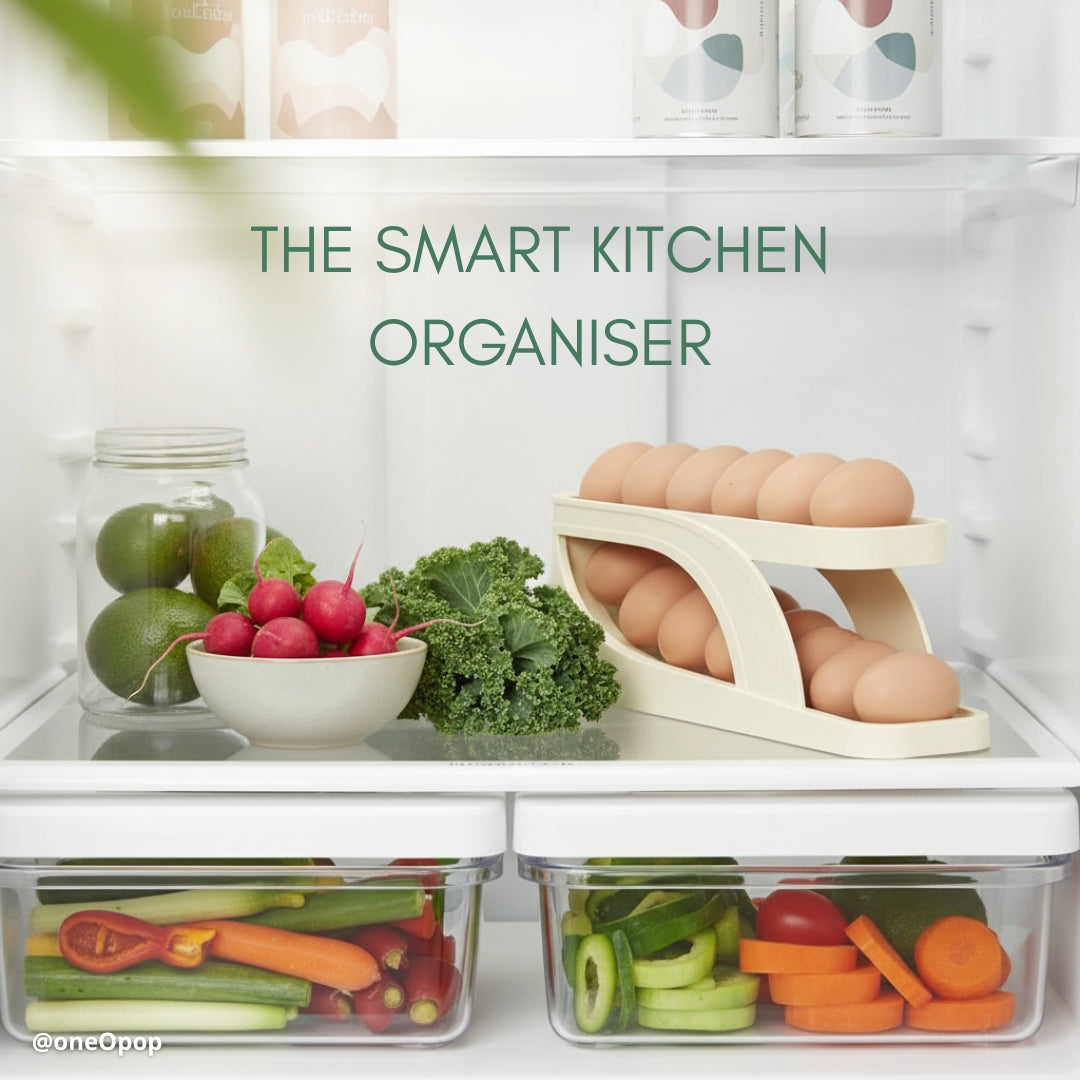 Meet the Roll’n’Store Egg Dispenser, the smart kitchen organiser that rolls eggs forward automatically—no stacking, no cracks, no fuss.