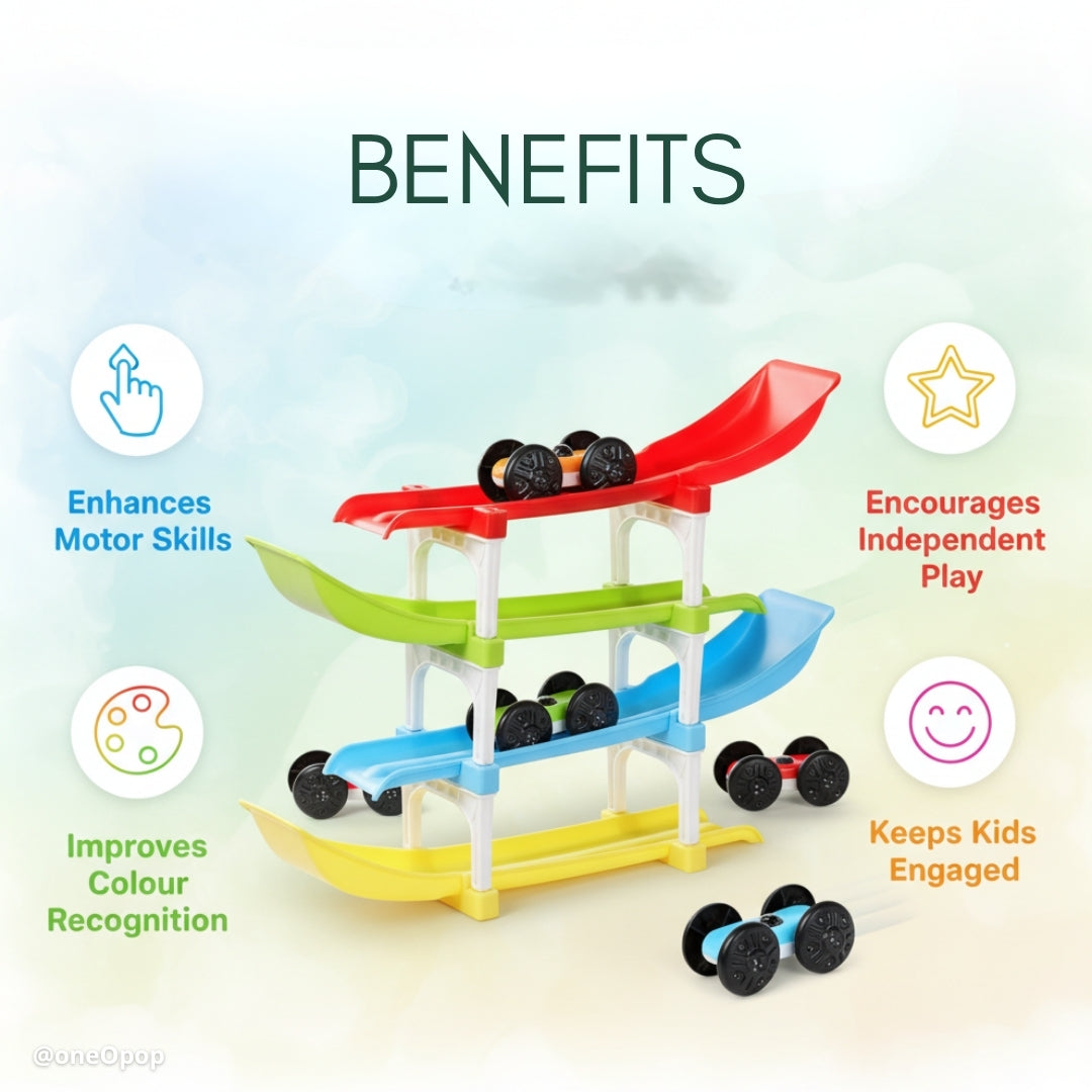The perfect racing adventure for toddlers! RaceRush Ramp Tower brings fast-paced action and early learning together.